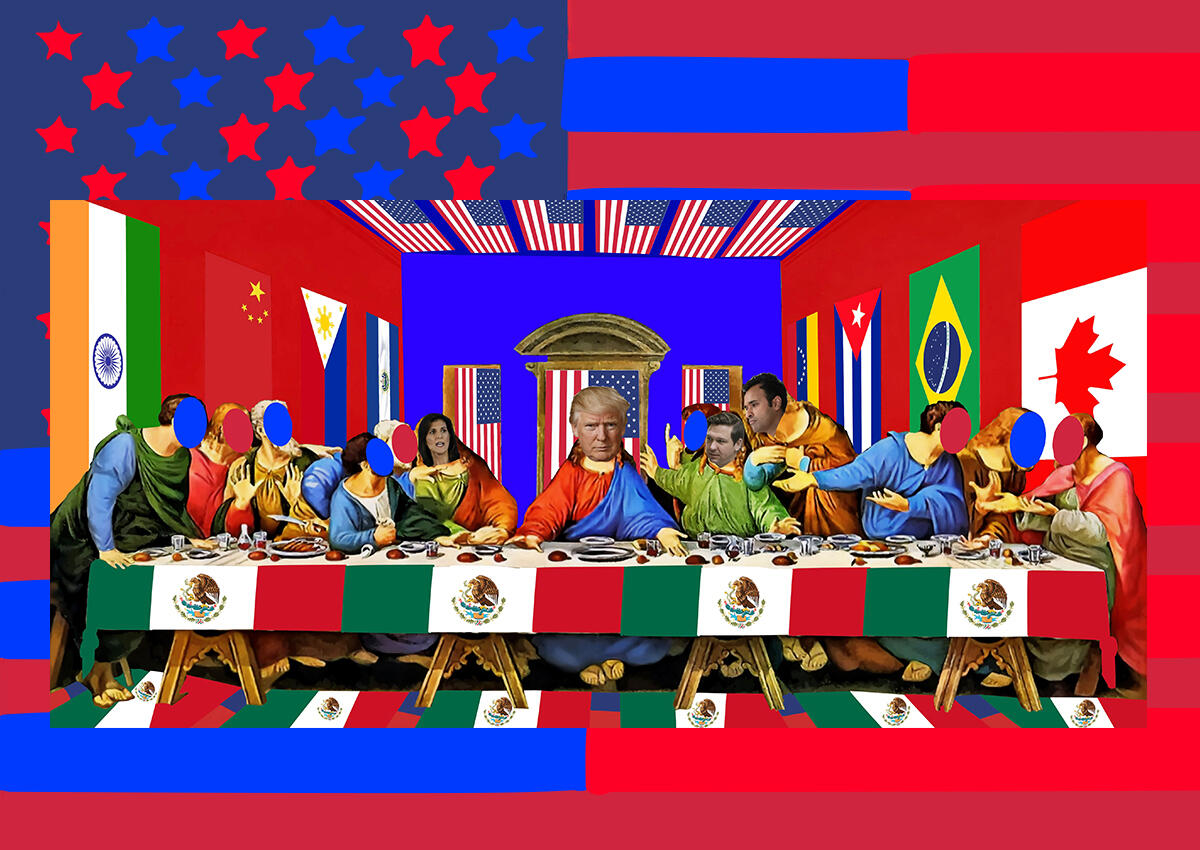 Mixed media works examining political narratives in the United States, immigration, and identity.